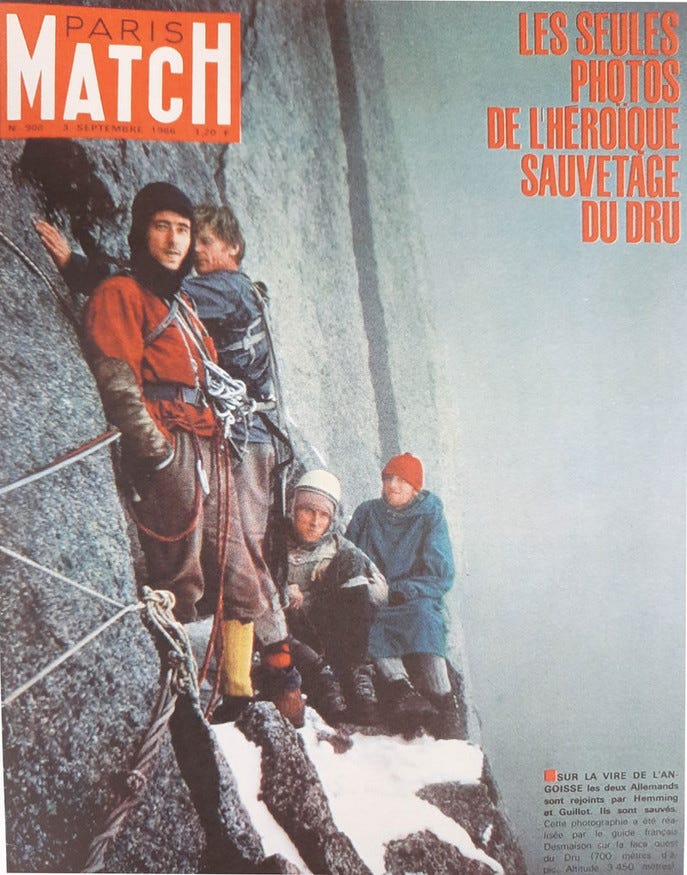 I can't comment on the rescue itself other than to echo what others have already said: it's a thing that would never happen in this era, in that mountain range. Rescues have been mounted under similar circumstances in the greater ranges, of course, an example being the attempted rescue of Inaki Ochoa on Annapurna where Steck, Anthematten, and Urubko, among others climbed to his aid but were unable to save him. The modern situations are rarely subject to intense, contemporaneous media scrutiny in the same way the Dru rescue was; approximately ten million people listened to radio broadcasts or read newspapers of the drama as it unfolded over many days. I wonder whether modern man's attention span (and expectation of a quick, happy conclusion) would be long enough to allow such immersion in a similar saga should it happen today.